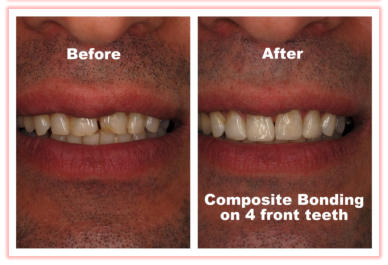 •An alternative to porcelain veneers•Less expensive than porcelain veneers or crowns•Performed in one visit, often without anaesthetic•Can be used to alter shape, colour and perceived position of teeth•More likely to stain than porcelain but can be repaired and polished